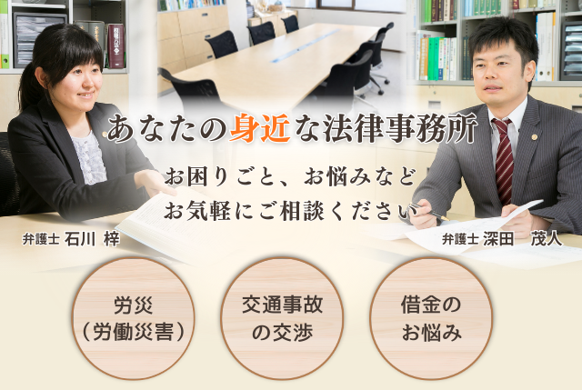 労災(労働災害)、交通事故、借金問題など、どうぞお気軽にご相談ください。
